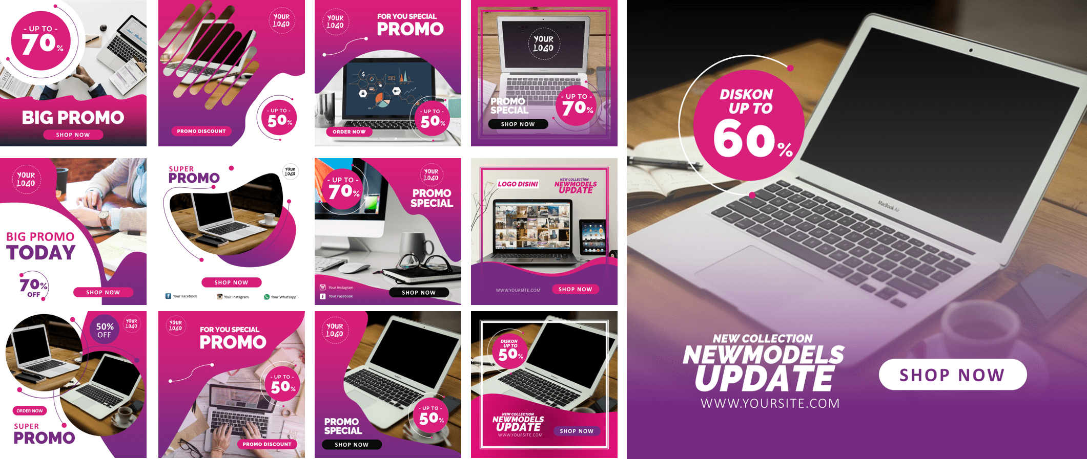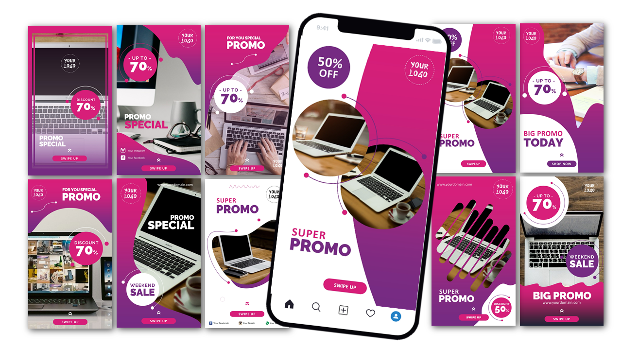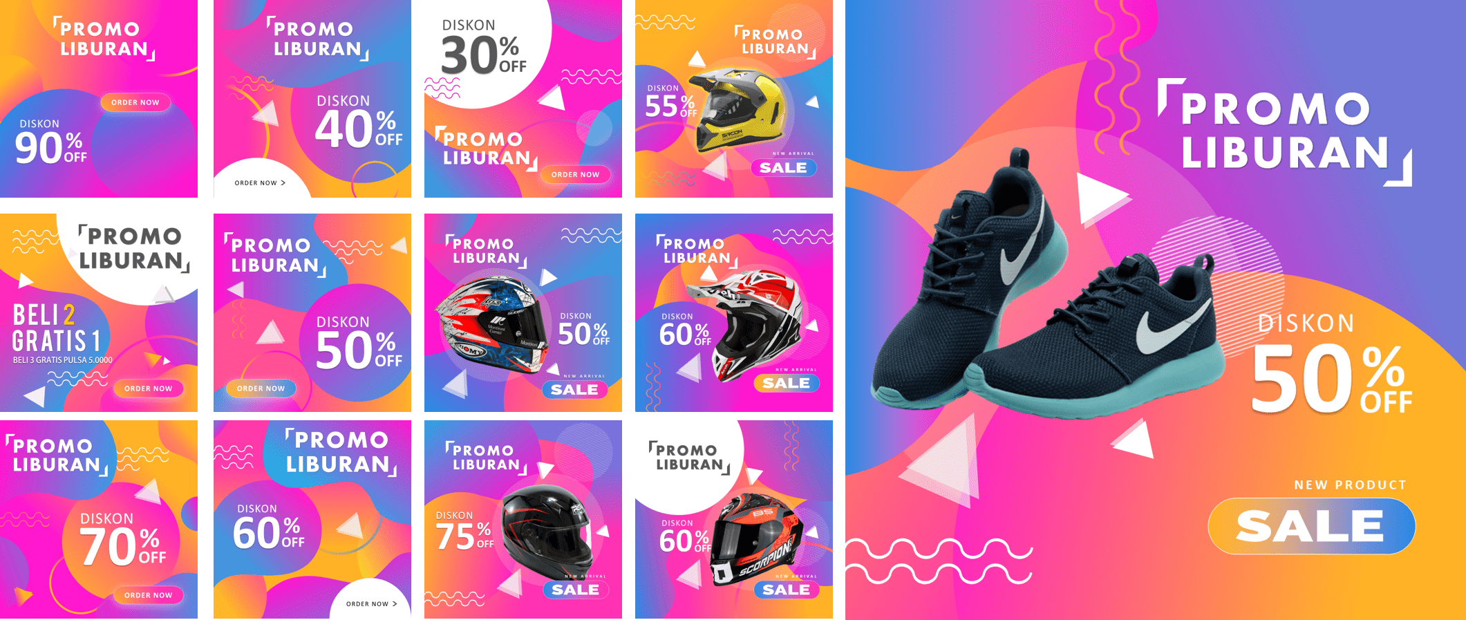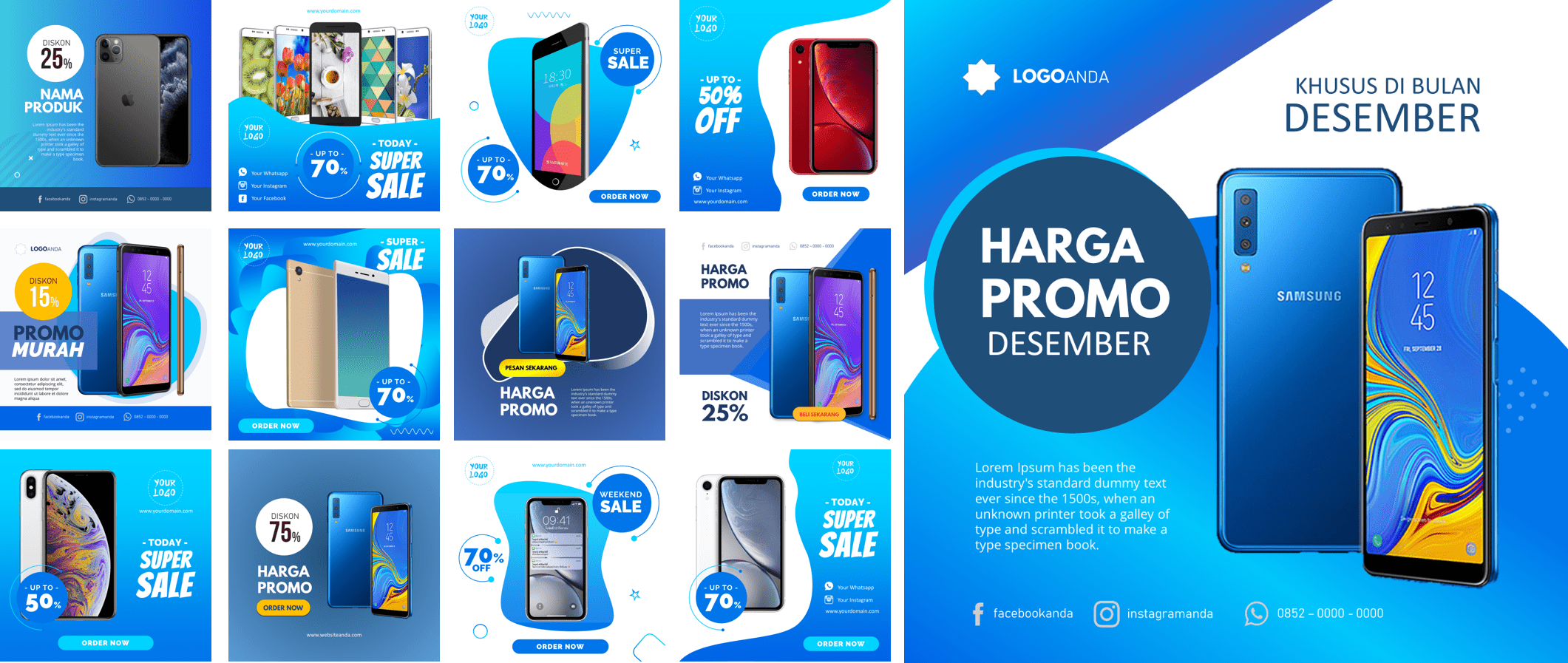 Ini adalah PAKET DESAIN PREMIUM yang berisi template-template desain powerpoint untuk membantu Anda membuat desain banner sosial media dengan mudah karena dibuat hanya dengan menggunakan powerpoint